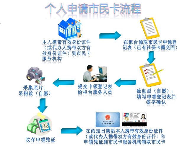 七、在约定日期后本人携带有效身份证件(或代办人携带双方有效身份证件)和申领凭证到市民服务机构领取市民卡