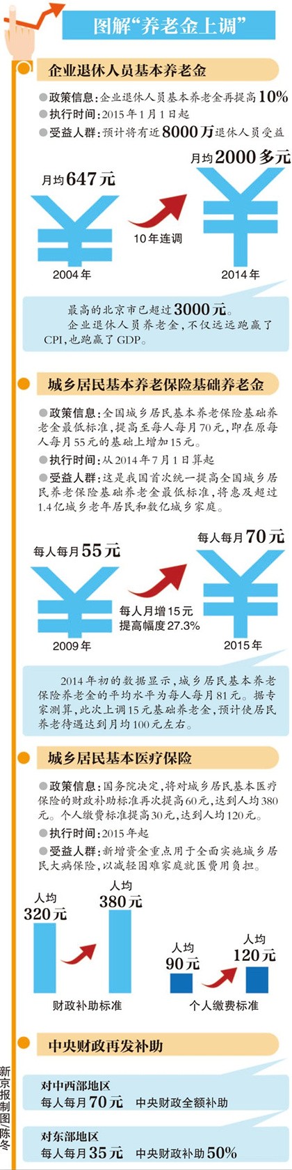 经国务院批准,全国城乡居民基本养老保险基础养老金最低标准提高至每人每月70元,即在原每人每月55元的基础上增加15元,提高幅度为27.3%,提高待遇从2014年7月1日算起。