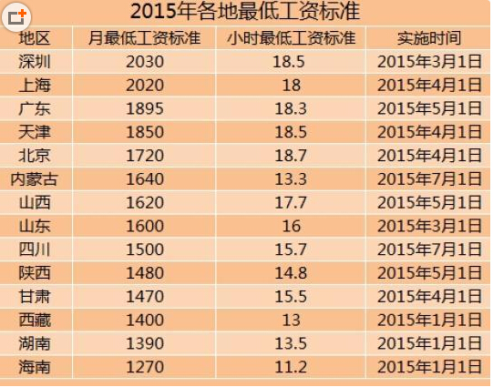 随着上述两个地区最低工资标准的上调,据记者不完全统计,进入2015年以来,全国已有湖南、海南、西藏、天津、深圳、山东、陕西、北京、上海、天津、甘肃、山西、四川、内蒙古等14个地区先后宣布提高最低工资标准。