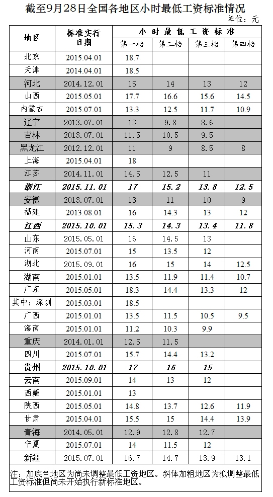 截至9月28日,北京地区以每小时18.7元的小时最低工资标准排各地区之首,垫底的为黑龙江,最低小时工资仅为每小时11元。同时,河北、辽宁、吉林、黑龙江、江苏等八个地区尚未调整最低工资。