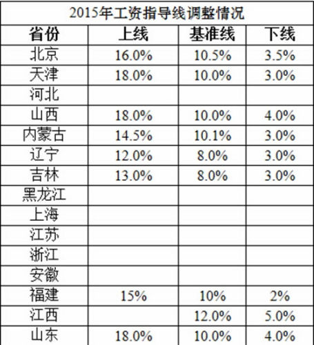 截至9月28日,18个省份调整了2015年工资指导线。其中,新疆、河南和江西3省份的基准线最高,达到12%;在平均工资增长上线方面,天津、山西、山东、河南4省份并列第一,上线水平达到18%;而工资增长的下线,陕西、甘肃和江西最高,为5.0%。