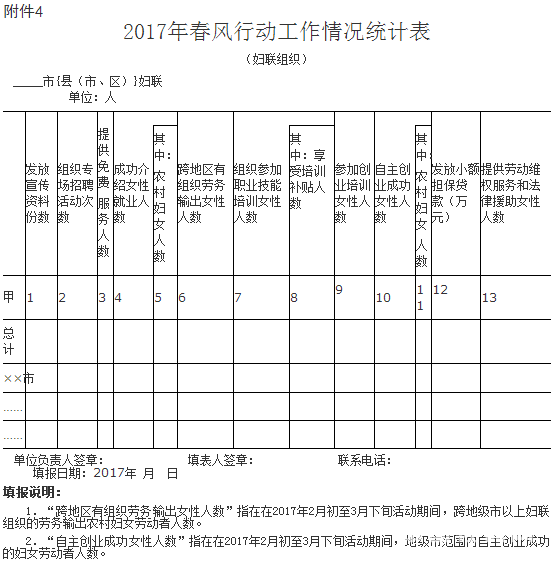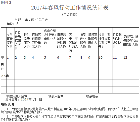 (四)及时统计总结。各县(区)人力资源和社会保障部门、扶贫工作部门、工会和妇联组织要加强与上级部门的沟通联系,及时准确做好统计、汇总和上报工作。各县(区)人力资源和社会保障局、扶贫办、总工会和妇联组织应于2017年1月16日前分别上报本部门负责春风行动工作的联系人和联系方式,并于2017年3月15日前上报本部门开展春风行动情况总结和统计表。