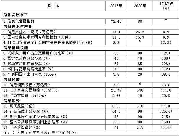 “十三五”信息化发展主要指标