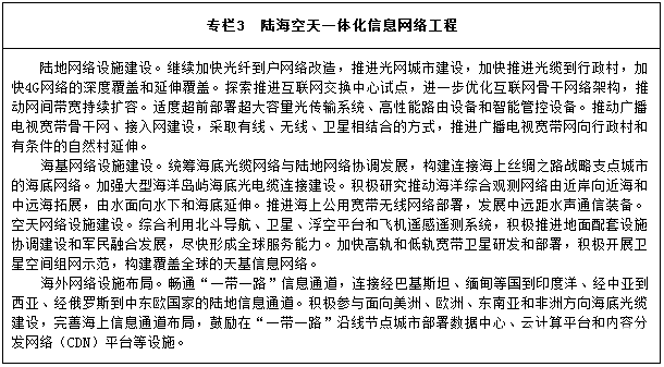 信息基础设施达到全球领先水平。“宽带中国”战略目标全面实现,建成高速、移动、安全、泛在的新一代信息基础设施。固定宽带家庭普及率达到中等发达国家水平,城镇地区提供1000兆比特/秒(Mbps)以上接入服务能力,大中城市家庭用户带宽实现100Mbps以上灵活选择;98%的行政村实现光纤通达,有条件的地区提供100Mbps以上接入服务能力,半数以上农村家庭用户带宽实现50Mbps以上灵活选择;4G网络覆盖城乡,网络提速降费取得显著成效。云计算数据中心和内容分发网络实现优化布局。国际网络布局能力显著增强,互联网国际出口带宽达到20太比特/秒(Tbps),通达全球主要国家和地区的高速信息网络基本建成,建成中国—东盟信息港、中国—阿拉伯国家等网上丝绸之路。北斗导航系统覆盖全球。有线、无线、卫星广播电视传输覆盖能力进一步增强,基本实现广播电视户户通。