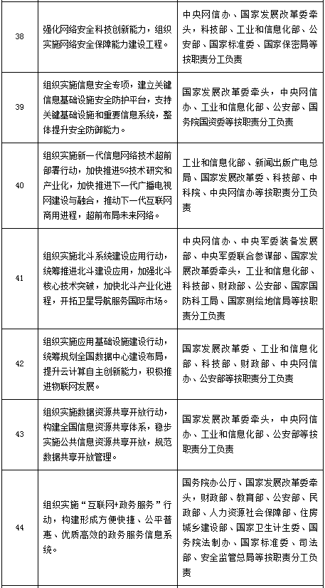 行动目标:到2018年,开展5G网络技术研发和测试工作,互联网协议第6版(IPv6)大规模部署和商用;到2020年,5G完成技术研发测试并商用部署,互联网全面演进升级至IPv6,未来网络架构和关键技术取得重大突破。