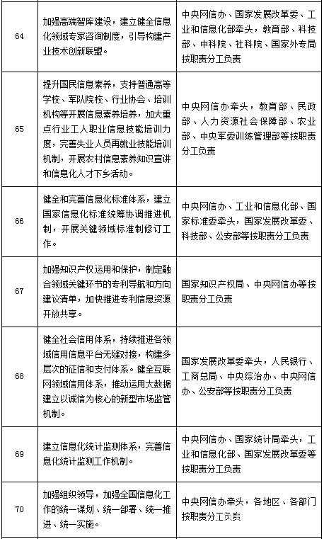 完善信息化标准体系,建立国家信息化领域标准化工作统筹推进机制,优化标准布局,加快关键领域标准制修订工作,提升标准实施效益,增强国际标准话语权。加强知识产权运用和保护,制定融合领域关键环节的专利导航和方向建议清单,鼓励企业开展知识产权战略储备与布局;加快推进专利信息资源开放共享,鼓励大型信息服务企业和制造企业建立交叉交换知识产权池;建立知识产权风险管理体系,健全知识产权行政执法与司法保护优势互补、有机衔接的机制,提高侵权代价和违法成本。健全社会信用体系,加强各地区、各部门信用信息基础设施建设,推进信用信息平台无缝对接,全面推行统一的社会信用代码制度,构建多层次的征信和支付体系;加强分享经济等新业态信用建设,运用大数据建立以诚信为核心的新型市场监管机制。加快研究纳入国民经济和社会发展统计的信息化统计指标,建立完善信息化统计监测体系。