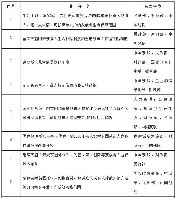 1.确保农村贫困残疾人如期脱贫。制定实施《贫困残疾人脱贫攻坚行动计划(2016—2020年)》。将农村贫困残疾人全部纳入精准扶贫建档立卡范围,强化分类施策和精准帮扶,政策、项目向贫困残疾人倾斜。加强实用技术培训、社会化生产服务和金融信贷支持,充分发挥农民专业合作社、龙头企业和残疾人扶贫基地的辐射带动作用,确保农村贫困残疾人家庭至少参与一项养殖、种植、设施农业等增收项目。有序组织农村残疾人转移就业。在资产收益扶贫工作中,财政专项资金形成的资产可折股量化优先配置给贫困残疾人家庭。积极引导贫困残疾人家庭采取土地托管或林权、农村土地承包经营权入股等方式,实现家庭资产增值增收。第一书记等驻村干部要将残疾人贫困户作为重点帮扶对象,选好配强帮扶责任人。将残疾人减贫成效纳入地方各级政府扶贫开发工作成效考核范围。持续实施“农村基层党组织助残扶贫工程”,依托“光伏扶贫”、“农家书屋”、“农村电商”等项目搭建社会力量参与残疾人扶贫开发平台。
