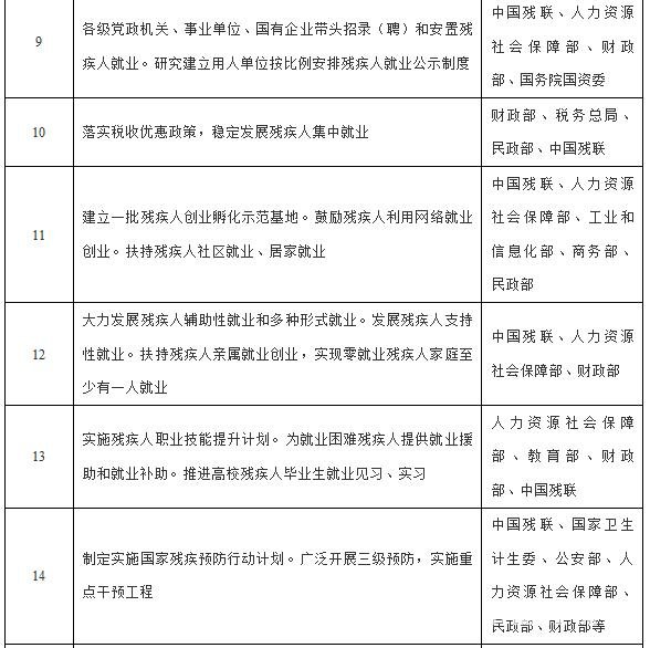 5.大力发展残疾人辅助性就业和多种形式就业。东部地区基本满足精神、智力和重度肢体残疾人等适宜人群的辅助性就业需求,中西部地区每个县(市、区)至少建有一所辅助性就业机构。为辅助性就业残疾人提供工资性补贴和社会保险补贴,对辅助性就业机构设施设备、无障碍改造等给予补助。政府开发的公益性岗位优先安排符合就业困难人员条件的残疾人。扶持残疾人亲属就业创业,实现零就业残疾人家庭至少有一人就业。