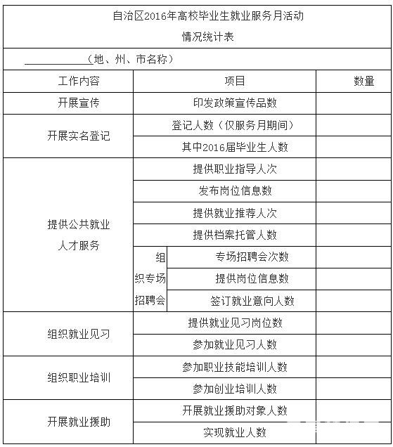 为贯彻落实《人力资源社会保障部关于开展2016年全国高校毕业生就业服务月活动的通知》(人社部函〔2016〕200号)精神,深入实施自治区促进高校毕业生就业创业专项行动计划,促进2016届离校未就业高校毕业生尽快实现就业,自治区决定组织开展2016年高校毕业生就业服务月活动(以下简称“服务月活动”)。现就有关事项通知如下: