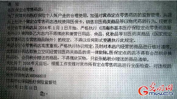 为了保障我市医疗保险个人账户金的合理使用,加强对我市定点零售药店的监督管理,从源头上杜绝个别定点零售药店违规使用医保卡,销售非医药类商品等以物代药的行为。现要求各定点零售药店从2016年1月1日起,严格执行《济南市基本医疗保险定点零售药店服务协议》第四条乙方店内不得摆放和兼营日用品、食品、化妆品等非医药类商品(国家规定由零售药店专营的商品除外)规定,不得以任何形式变通执行此规定。
