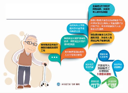 意见明确了20项重点任务,包括全面建立针对经济困难高龄、失能老年人的补贴制度;除极少数超大城市需按政策落户外,80周岁及以上老年人可自愿随子女迁移户口,依法依规享受迁入地基本公共服务;农村老年人不承担兴办公益事业的筹劳义务;鼓励通过基本公共卫生服务项目,为老年人免费建立电子健康档案;积极开展长期护理保险试点,探索建立长期护理保险制度;加快推进基本医疗保险异地就医结算工作;老年教育资源向老年人公平有序开放等。