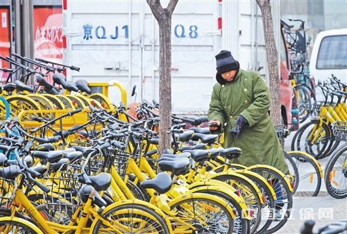 1月4日早高峰期间,北京市区内,一位共享单车地勤人员正在整理单车。他们既要随时协调调度车辆,也要及时对损坏车辆进行修理。本报记者 韩秉志摄