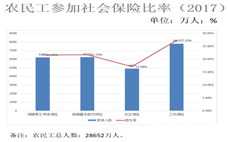 随着城镇化进程加快,农民工已经成为城镇地区劳动力市场数量最大的主力军。据人力资源与社会保障公报数据显示,2017年农民工总量28625万人,占城镇就业人口的67.5%。其中1980年及以后出生的新生代农民工首次占比过半成为主体,2017年占全国农民工总量的50.5%。老一代农民工没有完全退出历史舞台,占全国农民工总量49.5%。农民工的平均年龄不断提高,其中50岁以上农民工占比提高较快,2017年50岁以上农民工所占比重为21.3%,增速高于农民工总量0.5个百分点。但农民工参加社保的比率很低,这大大降低了他们的消费意愿。