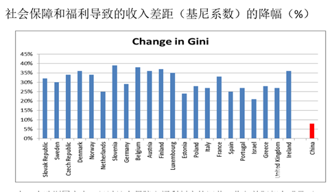 18个欧盟国家市场收入的基尼系数为0.443,但是在社会保障的作用下,这些国家的可支配收入基尼系数降为0.29,远低于中国的0.469。从下降幅度来看,欧盟国家政府的社会保障政策使得其基尼系数的平均值下降40%,相比之下,中国仅下降了12.3%。在22个欧洲国家中,经过社会保障和福利制度的调节,收入差距都有明显下降。降幅最小的是以色列,其收入差距的基尼系数也下降了22%,降幅最大的是斯洛文尼亚,其收入差距的基尼系数下降了38%。这些国家的平均降幅在30%左右。相比之下,中国社会保障和福利制度的调节力度非常有限。