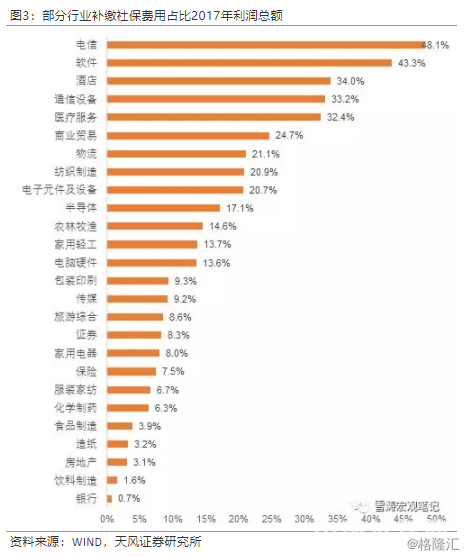 各行业的企业社保缴纳比例基本都没有达到30%的全额标准,如按标准足额缴纳,半数行业补缴费用占2017年利润总额的比重超过10%,且民企需补缴的比例更高。