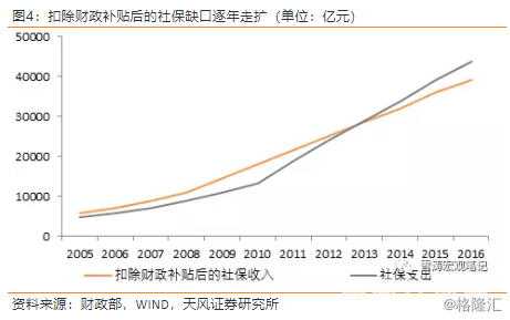 近年来社保基金虽然每年都有结余,但来自财政补贴的收入迅速增加。如果扣除财政补贴,自2013年起社保基金已收不抵支,且缺口有逐年扩大的趋势。例如,2016年社保基金收入50112.5亿元,其中财政补贴11088.6亿元,社保基金支出43604.9亿元,剔除财政补贴后年缺口达到4581亿元。