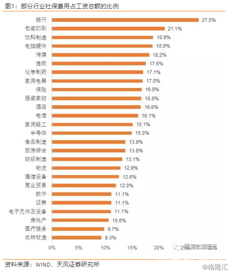 从全国的情况来看,如果按照实际工资足额缴纳社保,社保费率(社保费/工资总额)约为40%,其中企业缴纳约30%,个人缴纳约10%。我们从A股上市公司2017年报中提取了工资总额(工资+奖金+补贴+津贴)和实缴社保(社会保险费支出)数据,可以看出各行业的企业社保缴纳比例(实缴社保数额/工资总额)基本都没有达到30%的全额缴纳标准。