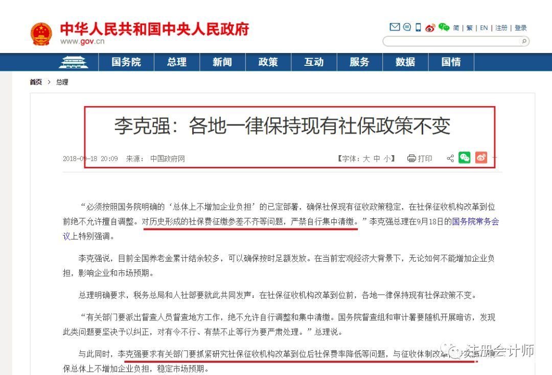 距离新社保正式实施的时间越来越近,近日,网上传出有地方进行社保清缴的消息,而国务院一锤定音,总理强调,“必须按照国务院明确的‘总体上不增加企业负担’的已定部署,确保社保现有征收政策稳定,在社保征收机构改革到位前绝不允许擅自调整。对历史形成的社保费征缴参差不齐等问题,严禁自行集中清缴。”