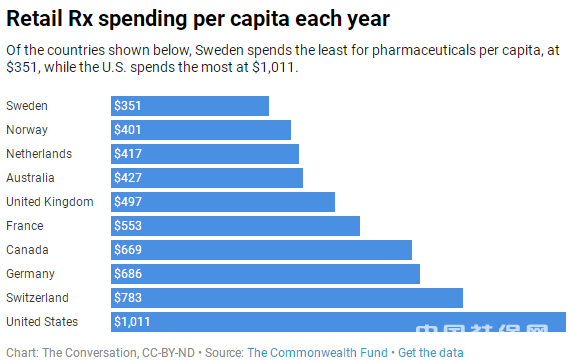 图说:Retail Rx调查,目前美国人均药品支出超过每年1000美元,而英国、加拿大只有这个数字的一半左右。