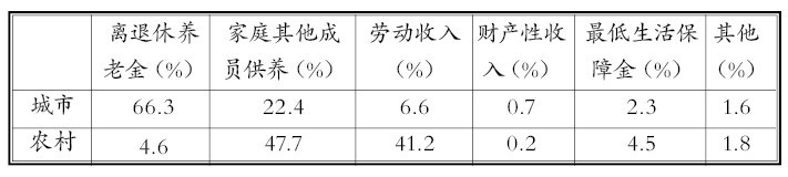 城乡差异。根据全国老龄委2012年公布的数据:“在覆盖率上,城镇养老保障的覆盖率为84.7%,而农村仅为34.6%;养老保障待遇水平上,城镇老年人的平均月退休金收入为1527元,而农村老年人的平均月养老金收入为74元;老年人的平均年收入结构方面,城市老年人的养老保障金占到86.8%,而农村老年人目前仍然主要靠家庭和土地养老,平均获得的养老保障仅占18.7%。”②另据中国人民大学老年学研究所的研究结果,“城市中有66.3%的老年人靠养老金生活,农村中只有4.6%的老年人靠养老金生活。”③城乡老年人的收入来源的差异,如下表:
