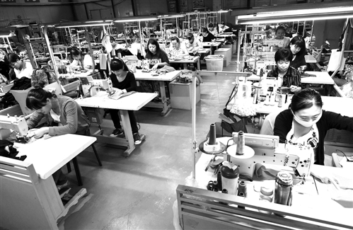 近年来,河北永清县通过加大农民培训力度,引进劳动密集型企业,为农民搭建就业平台,使该县万余名农民工离村不离乡,实现家门口就业。图为9月10日,永清县韩村镇楼台村京嘉服饰员工在加工服装。 新华社记者 李晓果摄