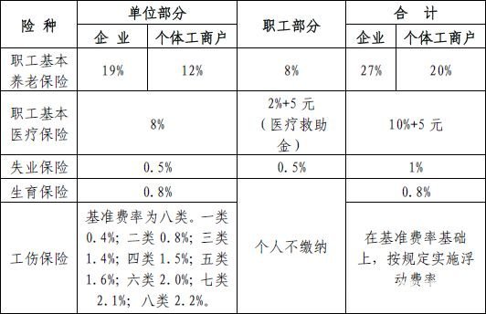 注:1.企业职工基本养老保险单位缴费比例执行时间为2016年5月1日起至2019年4月30日;失业保险单位缴费比例执行时间为2017年1月1日至2018年12月31日;生育保险单位缴费比例执行时间为2017年4月1日;阶段性工伤保险缴费比例降低50%执行时间为2018年5月至2019年4月。今后缴费比例如有调整,按最新调整文件为准。