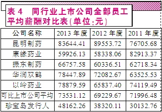 Õ䱦µºÔÚÕйÉÊéÖÐÌṩÁË×Ô¼º¹«Ë¾ÓëͬÐÐÒµÉÏÊй«Ë¾Ð½³êˮƽ¶Ô±È±í(±í4)£¬ÓɸñíÎÒÃÇ¿ÉÒÔ¿´³ö£¬Õ䱦µºµÄÔ±¹¤Ð½³êˮƽÓëͬÐÐÒµÉÏÊй«Ë¾Ïà±ÈʵÔÚÊÇÏÔµÃÌ«“Ðßɬ”£¬ÆäÖÐ2011ÄêÊý¾Ý¾¹È»Á¬Í¬ÐÐҵˮƽµÄÒ»°ë¶¼²»µ½£¬ËäÈ»ÔÚÆäºóÁ½ÄêÖУ¬¸Ã¹«Ë¾Ð½³êˮƽÓÐËùÔö³¤£¬µ«¾àͬÐÐÒµÉÏÊй«Ë¾Æ½¾ùн³êˮƽÈÔÊ®·ÖÒ£Ô¶¡£