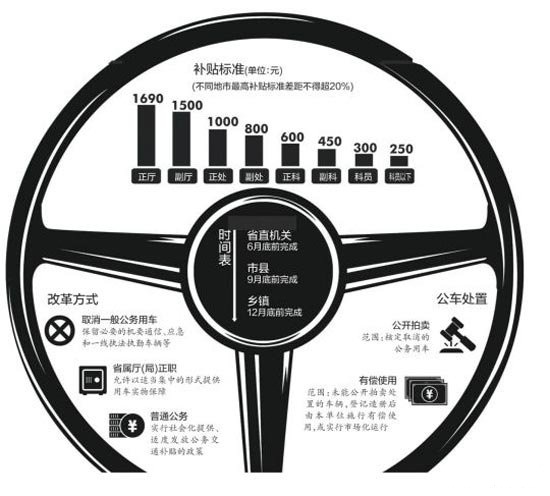 关于公车改革,一直牵挂着各方的视线。日前,广东省纪委主办刊物披露了最新广东公车改革方案具体内容,广东车改在严格执行国家规定之内执行,具体补贴标准为正厅级1690元,副厅级1500元,正处级1000元,副处级800元,正科级600元,副科级450元,科员300元,科员以下250元。同一地市补贴标准相同,不同地市之间规定最高相差要控制在20%之内。