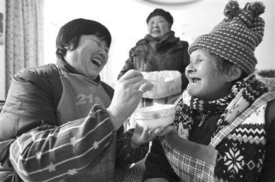 养老服务中心护理人员正一口口喂82岁的叶志芳婆婆吃午饭。