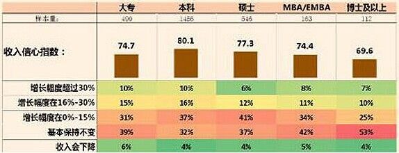 在收入信心方面,尽管收入水平总体处于中下游,本科生的收入增长信心最强,高达80.1。而博士生的薪酬水平更趋于稳定,认为基本保持不变的人超过半数。