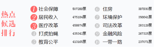 本次调查得到广大网民的热情响应。截至3月1日24时投票结束,参与网民超388万人次。其中,社会保障居选项热点排行榜首位,居民收入、医疗改革、打虎拍蝇和教育公平分列第二至第五。