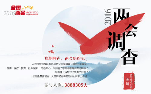 人民网北京3月2日电 (记者贾玥) 2016年全国两会即将在北京召开。作为全面建成小康社会决胜阶段的第一次全国两会,网民最关心什么?有哪些期待?从2月15日开始,人民网第十五次推出两会热点问题调查。