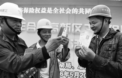 5月20日,合肥市一建筑工地的工人们在互相扫描《工伤保险知识手册》上的微信二维码。