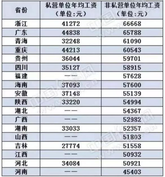 对比发现,城镇私营单位中,与全国平均工资水平39589元相比,18省中也仅有浙江、广东、重庆这3个省份超过了全国平均水平。