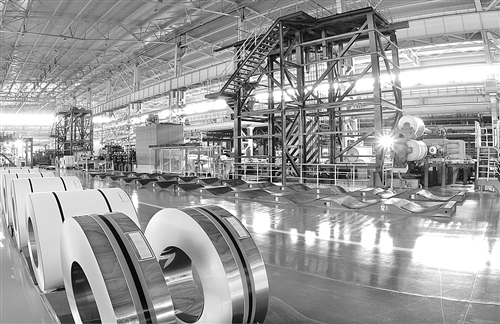 右图 社保费率下调,企业的负担进一步减轻。图为山西太原钢铁(集团)公司不锈钢冷轧车间。 (资料图片)
