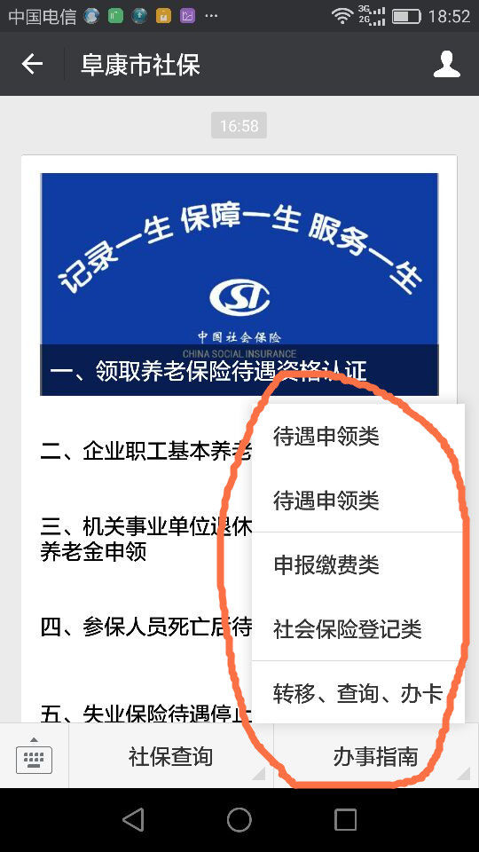 为配合“综合柜员制”服务模式顺利运行,我局将“阜康市社保”进行了改造升级,开设了“社保查询”、“办事指南”、“通知公告”三个便民服务菜单。