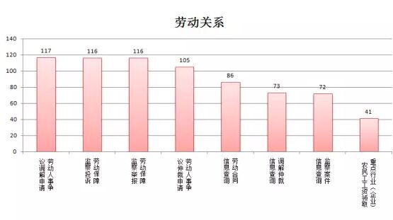 劳动关系方面,117个地市(占31.5%,比上年增加81个)实现劳动人事争议调解申请;116个地市实现劳动保障监察投诉和举报;105个地市实现劳动人事争议仲裁申请;86个地市实现劳动合同信息查询;41个地市实现重点行业(企业)农民工工资领取。