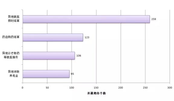 在跨地区方面,311个地市开展了社保卡的跨地区使用。其中,259个地市(占69.6%)实现医院异地就医即时结算;123个地市实现药店购药结算;106个地市(比上年增加28个)实现异地诊疗、取药等就医服务;95个地市实现异地领取养老金。