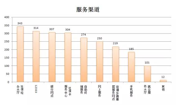 在服务渠道方面,除大厅柜台外,各地进一步积极向通过电子渠道服务发展。柜台服务中,343个地市(占92.2%)在社保经办大厅、307个地市在银行网点、304个地市在社保卡服务中心、219个地市在街道乡镇基层服务网点、101个地市在就业服务大厅设立了服务窗口。电子服务渠道中,314个地市开通12333电话服务,274个地市(比上年增加46个)开通自助终端服务,250个地市(比上年增加46个)开通网上服务,185个地市开通手机服务。