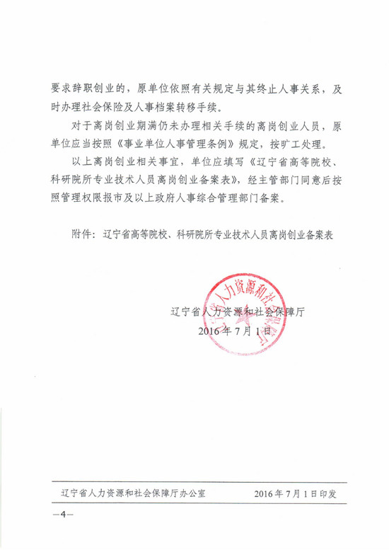 高校、科研院所等事业单位专业技术人员离岗创业的,经原单位同意,可在3年内保留人事关系,经审核批准可延长2年。”7月12日,辽宁省人力资源和社会保障厅下发《关于做好鼓励高等院校、科研院所专业技术人员离岗创业有关人事管理工作的通知》,对离岗创业技术人员离岗创业期间相关待遇做出规定,其中一大亮点在于明确表明鼓励态度--离岗创业人员创业期间,可保留人事关系,并与原单位其他在岗人员同等享有参加职称评聘、岗位等级晋升和社会保险等方面的权利。