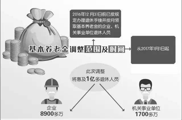 此次调整基本养老金的人员范围是为上年底前已退休人员,即2016年12月31日前已按规定办理退休手续并按月领取基本养老金的企业和机关事业单位的退休人员;当年退休人员不参加当年的待遇调整。此外,机关事业单位和企业的离休人员不属于此次调整范围。调整的时间从2017年1月1日起,估计在9月底之前可以基本发放到位。由于各地情况存在差异,特别是机关事业单位养老保险启动实施时间不长,工作基础和进展地区间不平衡,各地调整养老金发放到位的进度可能会有快有慢。