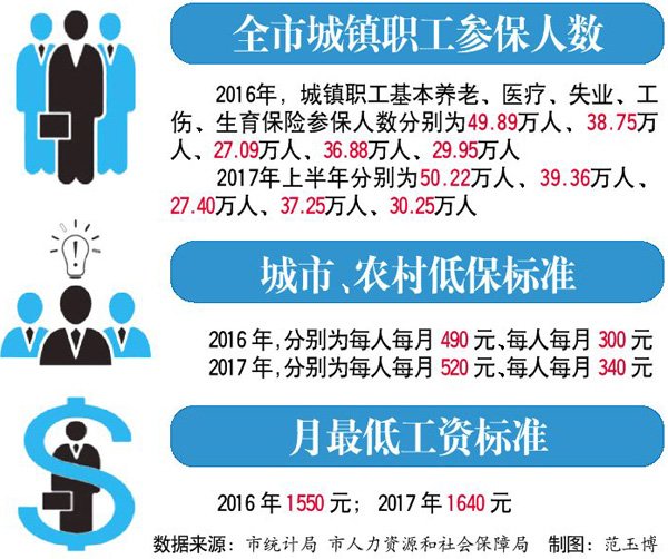 Éç»á±£ÏÕ¸²¸Ç·¶Î§½øÒ»²½À©´ó¡£Ëæ×ÅÎÒÊдóÁ¦ÊµÊ©È«Ãñ²Î±£µÇ¼Ç¼Æ»®£¬²Î±£ÈËÊýÁ¬ÄêÔö³¤¡£2016Ä꣬ȫÊгÇÕòÖ°¹¤»ù±¾ÑøÀÏ£¨²»º¬ÀëÍËÐÝ£©¡¢Ò½ÁÆ¡¢Ê§Òµ¡¢¹¤ÉË¡¢ÉúÓý±£Ïղα£ÈËÊý·Ö±ð´ïµ½49.89ÍòÈË¡¢38.75ÍòÈË¡¢27.09ÍòÈË¡¢36.88ÍòÈË¡¢29.95ÍòÈË£»¾ÓÃñ»ù±¾ÑøÀÏ¡¢Ò½ÁƱ£Ïղα£ÈËÊý·Ö±ðΪ139.67ÍòÈË¡¢222.69ÍòÈË¡£2017ÄêÉϰëÄ꣬³ÇÕòÖ°¹¤»ù±¾ÑøÀÏ£¨²»º¬ÀëÍËÐÝ£©¡¢Ò½ÁÆ¡¢Ê§Òµ¡¢¹¤ÉË¡¢ÉúÓý±£Ïղα£ÈËÊý·Ö±ð´ïµ½50.22ÍòÈË¡¢39.36ÍòÈË¡¢27.40ÍòÈË¡¢37.25ÍòÈË¡¢30.25ÍòÈË£»¾ÓÃñ»ù±¾ÑøÀÏ¡¢Ò½ÁƱ£Ïղα£ÈËÊý·Ö±ð´ïµ½138.8ÍòÈË¡¢229.23ÍòÈË¡£