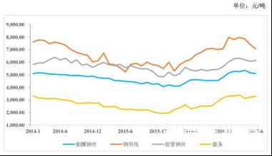 根据中国钢铁工业协会披露数据,2016年1月起,上述主要材料价格从 2014-2016年的谷底开始震荡上升,并在年底价格开始明显上涨,当年公司胎圈钢丝销售价格也随之逐步提升。因滞后性2017 年1-6月原材料价格较上年度波动上涨,当期胎圈钢丝钢丝平均售价随之提升。