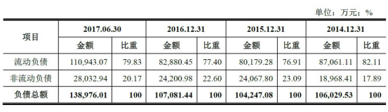 2014-2016年及2017年6月末,大业股份负债总额为10.60亿元、10.42亿元、10.71亿元和13.90亿元,资产负债率(母公司)分别为74.34%、70.87%、65.42%及69.22%,负债主要是银行借款。