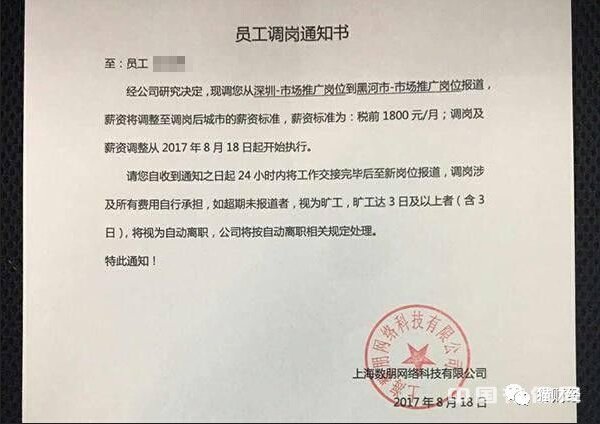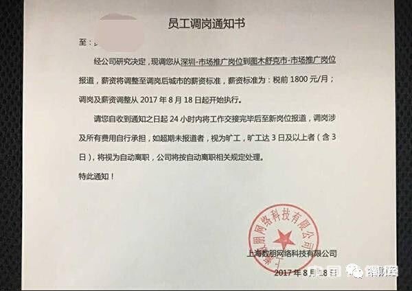 月薪从4000元降到1800元、24小时内要自费从深圳赶往新疆博乐市报到、逾期3天将被视为自动离职……