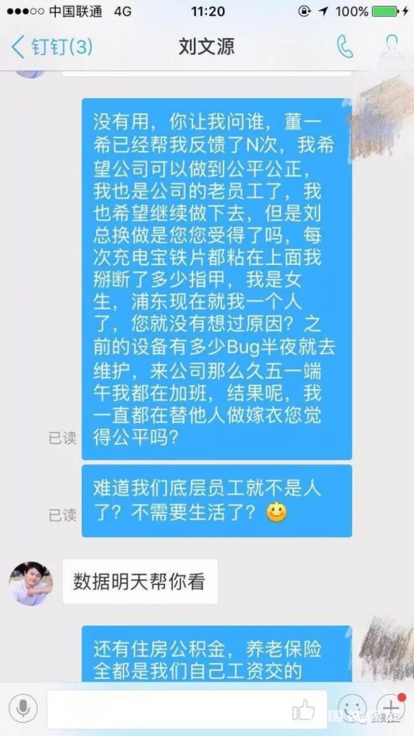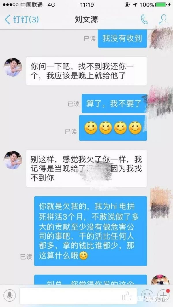小唐表示,自己曾询问过公司人事欠薪一事,而人事让他打电话给CEO刘文源咨询。“我第一次打过去,说没空,周末再联系;第二次打过去,还说没空,晚上再联系;第三次打过去,一听是我,立马一句“在开会”,挂了。”