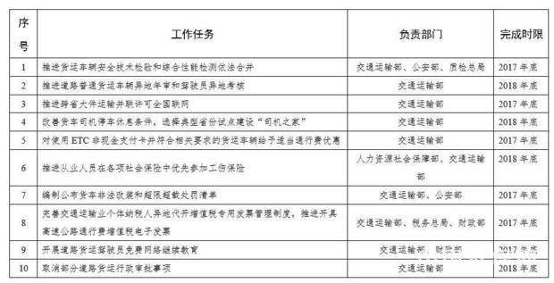 2018年底前,完成降本减负10件实事,使货车司机生产生活条件显著改善。