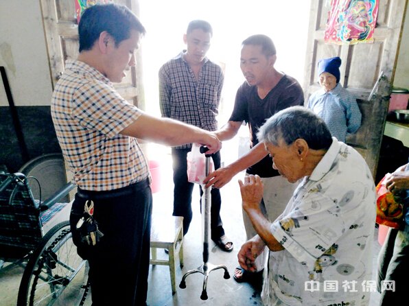 (图为:龙源口卫生院长贺龙华等人回访贫困患者张龙英,送药、送拐杖)