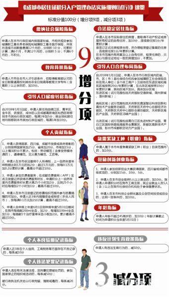 昨日,成都市人民政府门户网站发布《成都市居住证积分入户管理办法实施细则(试行)》(以下简称《细则》),有效期2年。《细则》详细规定了12个居住证积分的具体指标及其分值,其中9项为增分项,3项为减分项。积分入户的积分标准分值为100分。
