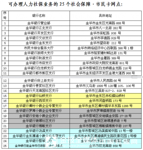 目前,已全面开通金华银行市本级25个多功能网点对外办理社保业务。下一步,将全面启动各县市社会保障·市民卡网点代办服务。